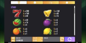 Nejvýnosnějším symbolem automatu je bezesporu sedmička, která se pyšní násobitelem až 200x. Tato ikona nejenže zahřeje srdce každého hráče, ale také přináší možnost solidních výher. Když se potká s multiplikátorem, který přináší symbol wild, mohou se vaše výhry rychle znásobit a přetvořit běžné hraní v nezapomenutelný zážitek. Pokud se zaměříme na jednotlivé symboly, třešně přinášejí malé, ale jisté výhry, zatímco citrony a pomeranče nabízejí podobnou hodnotu. Švestky a melouny pak přinášejí větší násobky, což zvyšuje napětí a očekávání při každém otočení válců. Meloun, se svými násobky 40x za pět symbolů, je jedním z těch, které mohou výrazně přispět k celkovému zisku. A co se týče zvonů, ty se pyšní násobky až 160x, což je pro hráče lákavá příležitost k zisku.