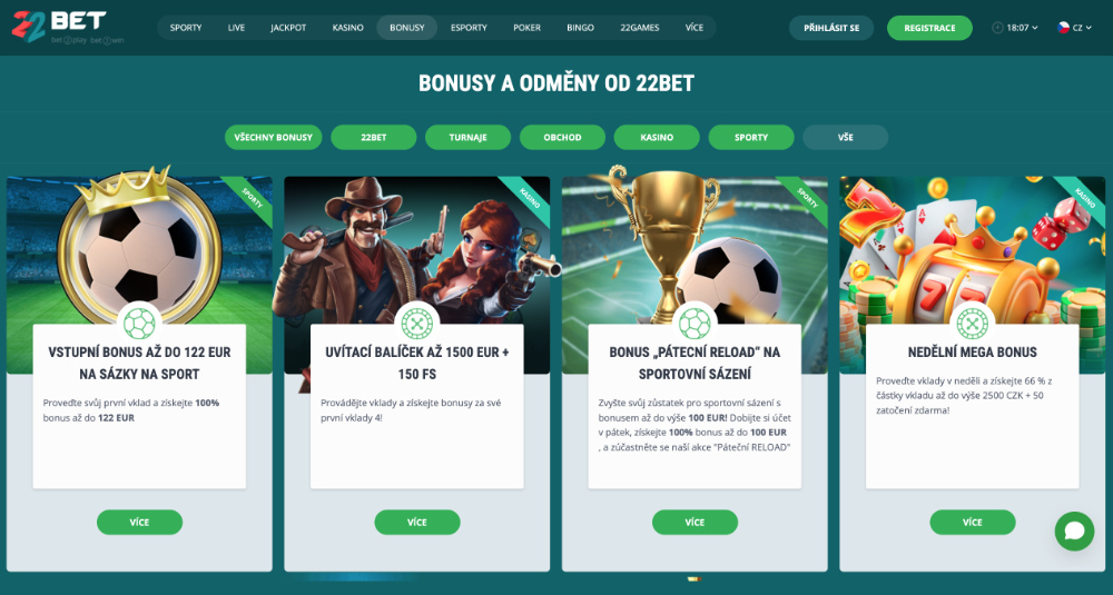 V 22BET se můžete těšit na širokou nabídku bonusů pro online casino i sázkovou kancelář