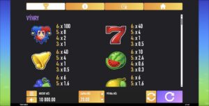 El slot en línea creado por Tech4Bet se presenta como un juego emocionante que atrae tanto a los amantes de las tragaperras clásicas como a los nuevos jugadores que buscan diversión con temas frutales. A primera vista, destaca por su apariencia retro, que evoca nostalgia y transporta a los jugadores a los días en que las tragaperras giraban en los salones físicos. La gráfica está diseñada con gran atención a los detalles, lo que contribuye a una interfaz amigable, cuya claridad facilita la navegación entre los símbolos y funciones del juego. Las animaciones son fluidas y agradables visualmente, dando la sensación de estar en un entorno de juego vibrante. Se ha prestado especial atención a las animaciones de los símbolos scatter y del juego de bonificación, añadiendo atractivo a la atmósfera general. Los jugadores pueden esperar experiencias emocionantes y sorpresas en cada giro de los carretes. En cuanto a los símbolos, se incluyen frutas clásicas, típicas de las tragaperras retro. Entre los símbolos más importantes están las cerezas, limones, naranjas, ciruelas y peras, que no solo traen nostalgia, sino también emoción por las ganancias. Cada símbolo tiene un valor que depende de la cantidad de símbolos en la línea. Por ejemplo, las cerezas, símbolo de la suerte en muchos aspectos, pueden otorgar premios de hasta 3x la apuesta por 6 símbolos en línea. Otros símbolos interesantes incluyen melones, uvas y campanas, cada uno con multiplicadores específicos. El melón, como uno de los símbolos más altos, puede proporcionar una ganancia de hasta 10x la apuesta por 6 símbolos en línea. Las campanas y los sietes, considerados símbolos clásicos de la suerte, pueden otorgar hasta 40x la apuesta, agregando una dimensión extra al juego y despertando el deseo de mayores premios. El símbolo más importante del juego es el símbolo wild, que actúa como un joker y tiene el poder de reemplazar otros símbolos en los carretes. De esta manera, puede ayudar a los jugadores a formar combinaciones ganadoras y, además, ofrece el pago más alto de hasta 100x la apuesta por 6 símbolos. El símbolo wild se convierte en un elemento clave que puede influir significativamente en la experiencia de juego y traer suerte a los jugadores.